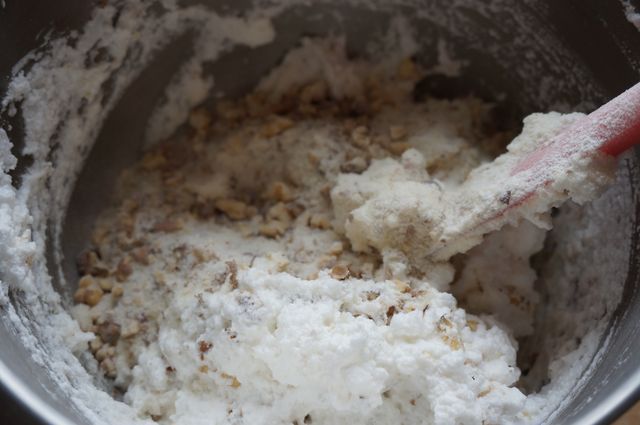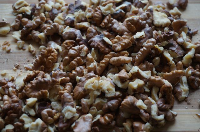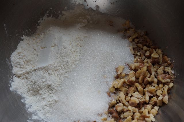 Орехи подсушить в духовке или СВЧ, измельчить скалкой.