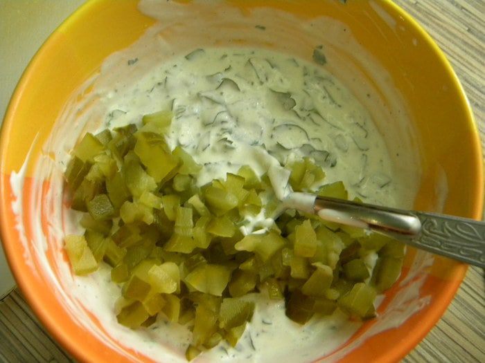 Соус: сметану смешиваем с чесноком, перцем, солью, зеленью и нарезанным огурчиком мар.