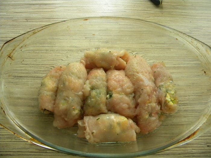 На филе выкладываем начинку и сворачиваем в рулетик и кладем в форму для запекания, так проделываем со всеми.