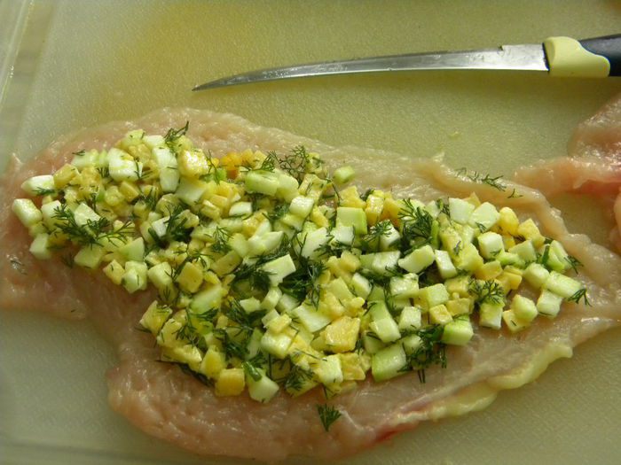 Начинка: вареное яйцо мелко режем, кабачок тоже, укропчик, чеснок, соль по вкусу,тв. сыр, всё смешиваем.