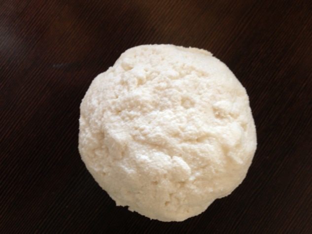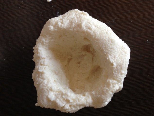 Делим получившуюся массу на 2 равные части и формируем из них довольно крупные шарики, делая углубление посередине.