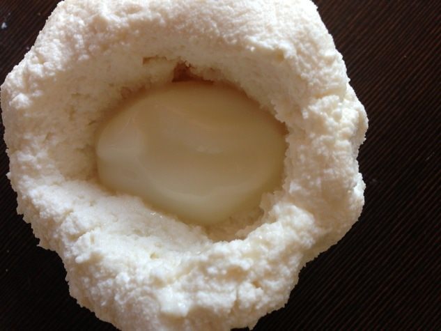 В углубление кладем начинку (количество регулируйте сами, я положила чайную с горкой ложку). Но много лучше не класть, чтобы проще было формировать орех. Для начинки я взяла нежирный сладкий йогурт.