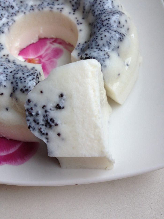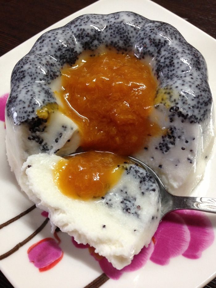 Десерт получается легким, нежным и воздушным. При застывании он делится на слои: слой плотного желе с маком и слой воздушного мусса.