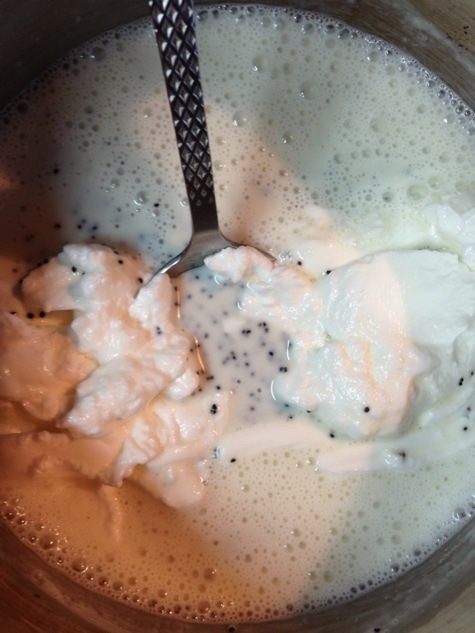 Смешать йогурт со сливками (я брала нежирные 10%), добавить, помешивая, тонкой струйкой желатин. Затем подмешать набухший мак и взбитый белок.