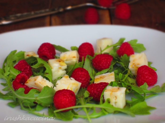 Выложить на блюдо руколу, сыр, малину. Соединить оливковое масло, бальзамический уксус, добавить соль, перец и заправить салат. Приятного аппетита:))