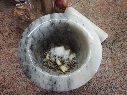 Пока лук золотится, в ступке растереть чеснок с солью и кориандром.