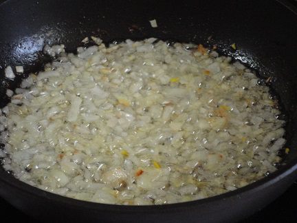 Лук мелко нарезать и обжарить в растительном масле до золотистого цвета.
