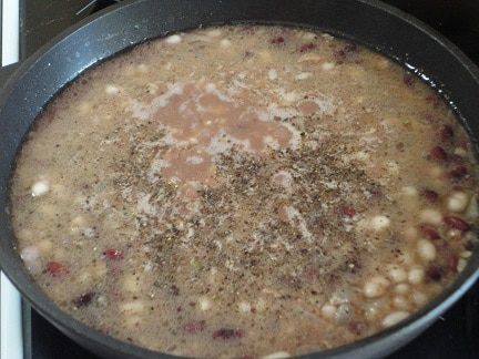 К соусу добавить вареную фасоль, влить стакан отвара, приправить специями, закрыть крышкой и тушить еще 10 минут.