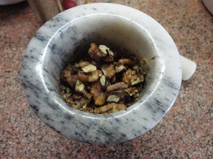Добавить орехи и истолочь до однородного состояния. Влить винный уксус и полстакана отвара. Перемешать и переложить в сковороду к обжаренному луку. Добавить еще с полстакана отвара и тушить на медленном огне под крышкой 5-7 минут.