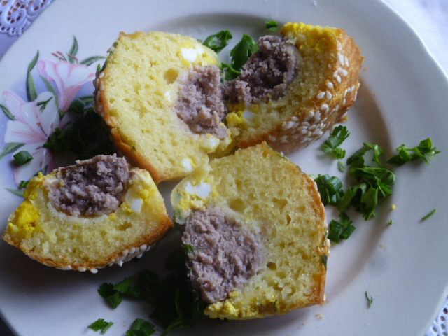 Можно сделать так, налить в формочку сверху фрикадельки немного теста и потом посыпать варенным яйцом. И сверху залить тестом.