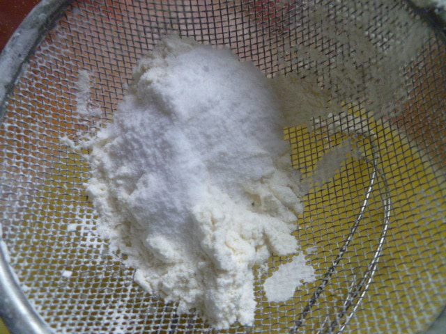 Смешать муку с содой. Я просеиваю сразу через ситечко в тесто.