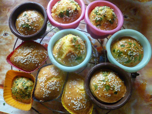 Наливаем тесто в формочки. Сверху я посыпала кунжутом и зеленью.