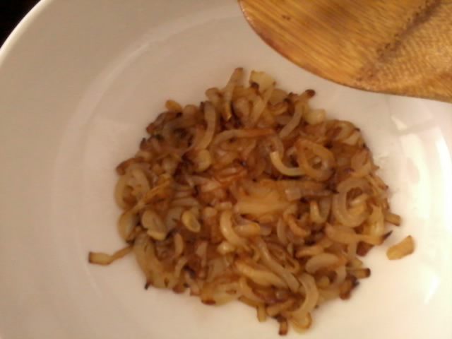 Лук нарезать полукольцами и обжарить до золотистого цвета на оливковом масле.