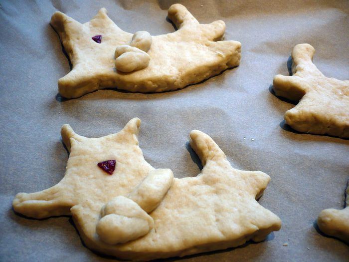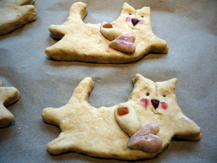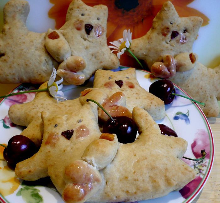 Кусочек кураги — пуговка для лапки. Глазки — зернышки кардамона. Сначала я подкрасила щеки и сердечко вишневым соком, но в процессе выпечки он становится очень блеклым, поэтому предлагаю сварить сироп из сахара и вишневого сока, дать ему пару минут покипеть, снять с огня, дать полностью остыть и стать густым.