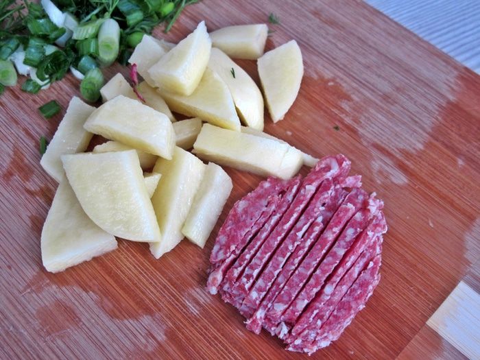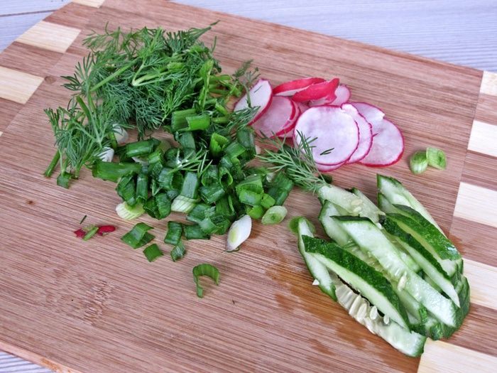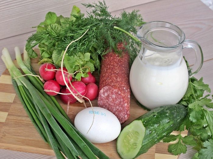 В отдельной посуде смешиваем йогурт,охлажденную воду в соотношении 2:1. Добавляем по вкусу уксус. Кладём нарезанные овощи, солим, хорошо перемешиваем. Разливаем окрошку по тарелкам, украшаем салями, вареным яйцом, зеленью. Добавляем несколько кубиков льда. И сразу подаём.