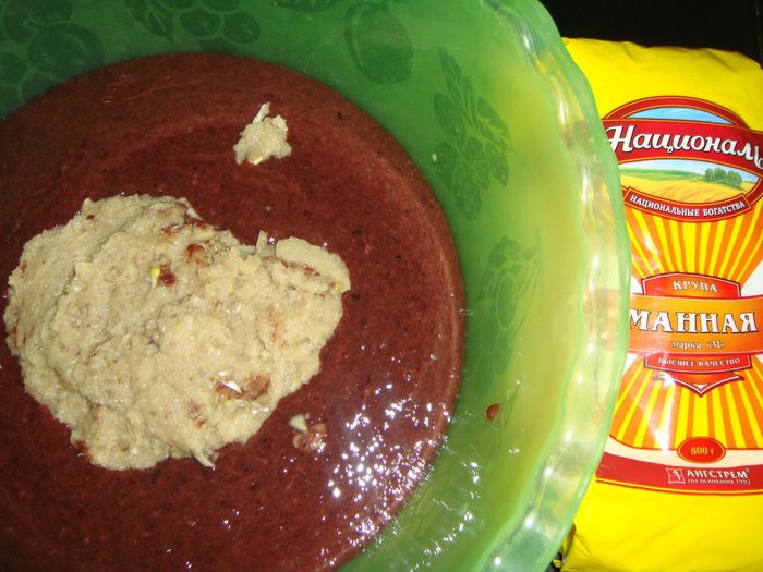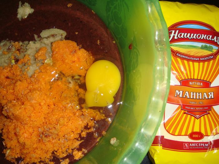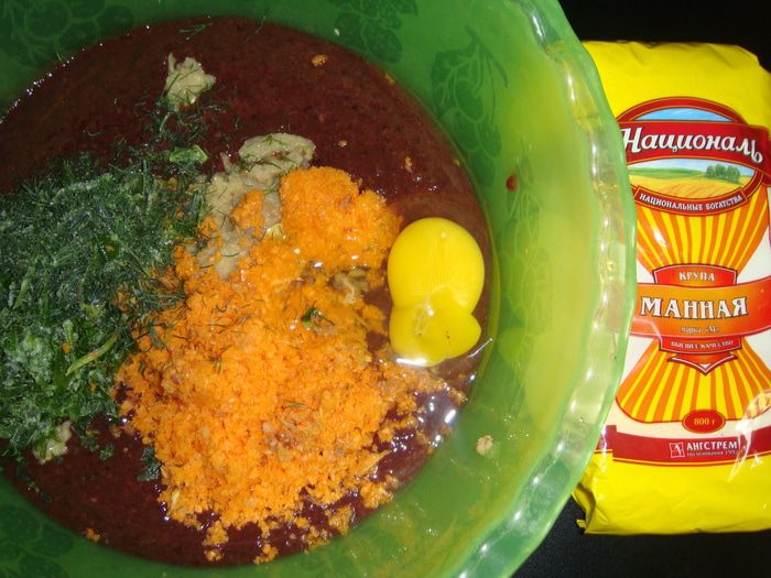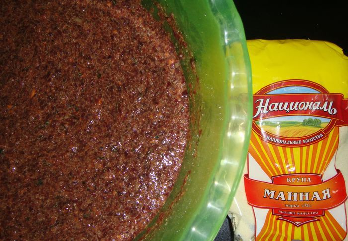 Всыпать манную крупу ТМ «Националь», посолить и поперчить по вкусу.