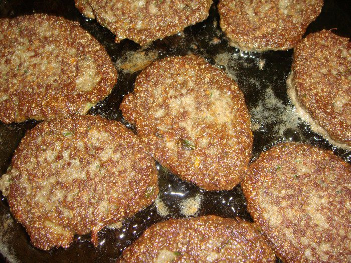 Сковороду нагреть, влить часть подсолнечного масла. Выкладывать смесь столовой ложкой.
