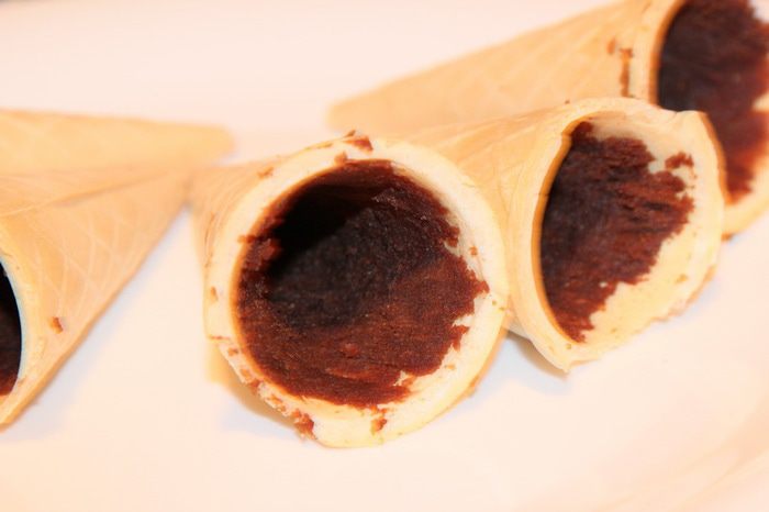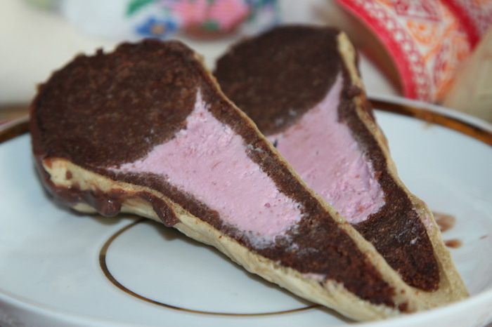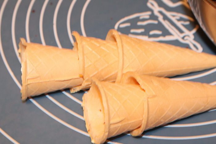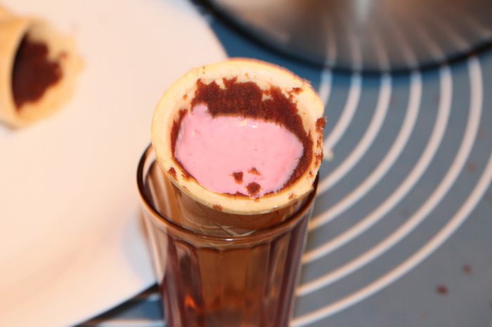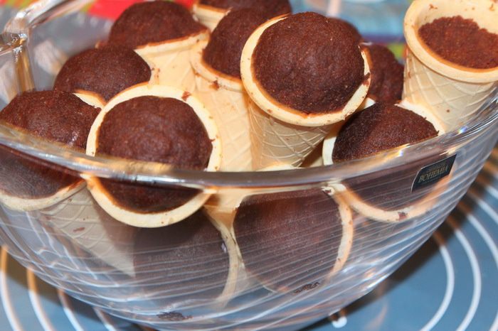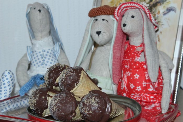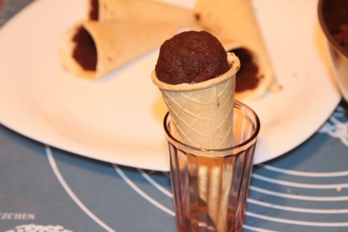 Готовую глазурь в дропсах, я взяла по 50 грамм белой и черной, топим на водяной бане. Если масса получится густая. можно добавить 30 мл сливок 10% жирности. Подмороженные рожки достаем из морозилки и чайной ложкой поливаем сверху глазурь. Поворачиваем рожок так, чтобы глазурь равномерно растекалась по поверхности шарика. Я еще сверху посыпала смолотыми орешками. Получилось такое немороженное "мороженное". Отправляем в морозильную камеру. Достаем за 30 минут до подачи.