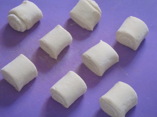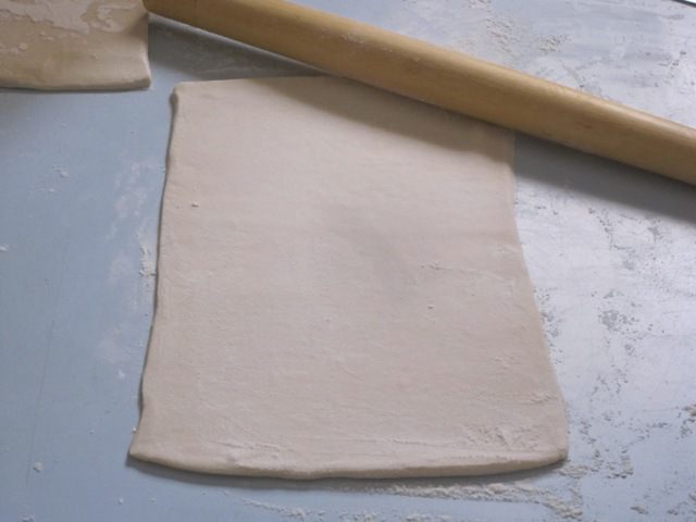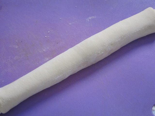 Каждый пласт слоеного дрожжевого теста, а у меня их было 2, разморозить. Раскатать в одну сторону до длины 30 см.
