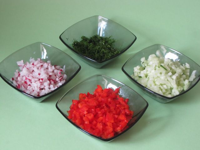 Для салата огурец, редиску, сладкий перец вымыть, нарезать небольшими кубиками. Укроп вымыть и нарезать.Огурец можно очистить от кожуры.