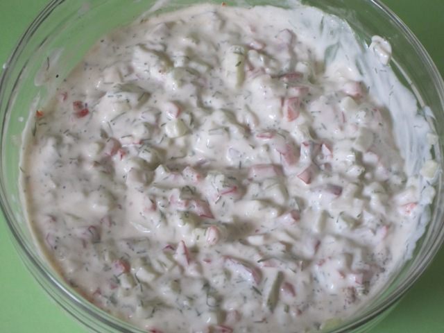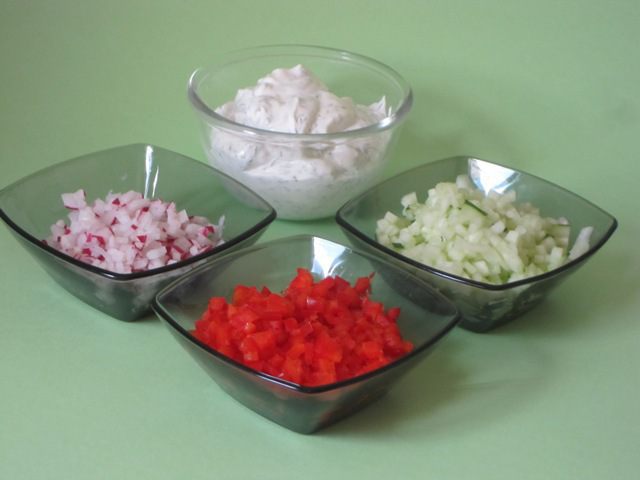 Сливочный творожный крем взбить со сметаной и мелко нарезанным укропом. Посолить, поперчить, добавить тертый чеснок.