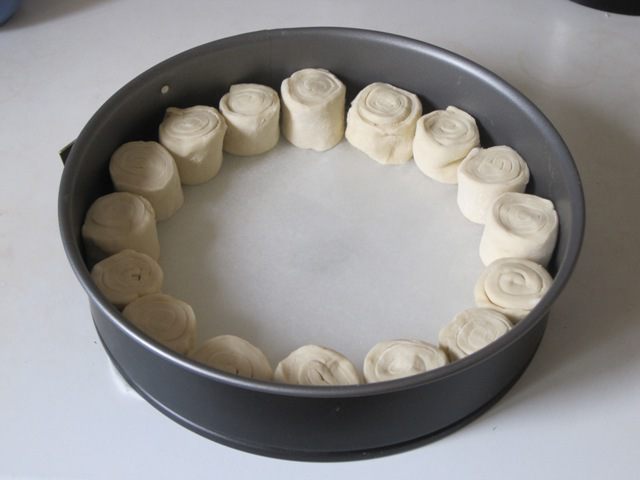 Дно круглой формы размером 24-26 см застелить бумагой для выпечки. Выложить кружки теста по кругу.