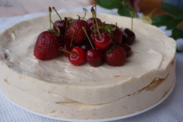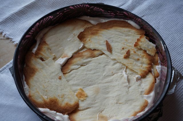 Накрыть порцией суфле, положить еще 2 коржа, сверху тонкий слой суфле.