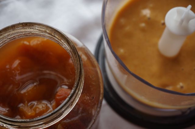 Абрикосовое варенье (у меня домашнее - половинки абрикос) измельчить в блендере. Можно использовать джем - еще лучше. Перетереть через сито (по желанию), подогреть в СВЧ или на слабом огне до горячего состояния.