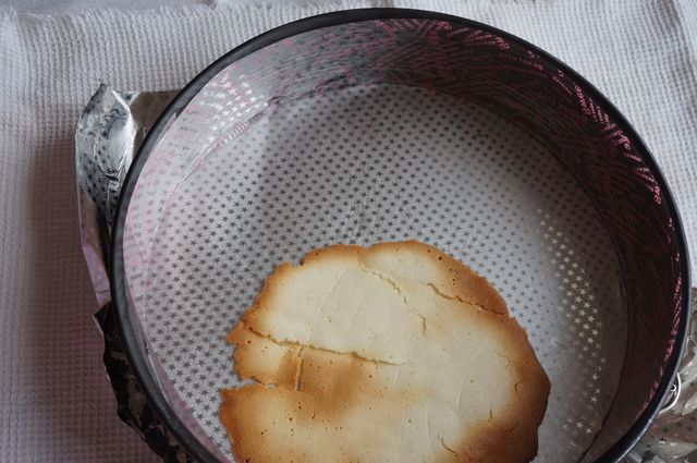 Форму (у меня 26 см) застелить пищевой пленкой или фольгой, вдоль стенки проложить ацетатную пленку. Выложить на дно 2 коржа (внахлест).