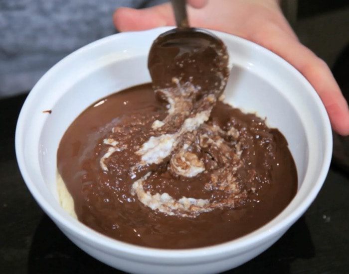 А во вторую часть — растопленный темный шоколад.