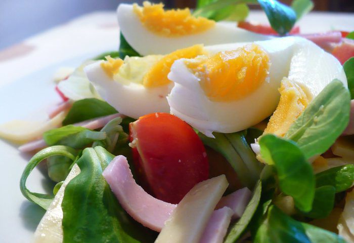 Распределяем заправку по салату, остывшее яйцо выкладываем на салат. Приятного аппетита!
