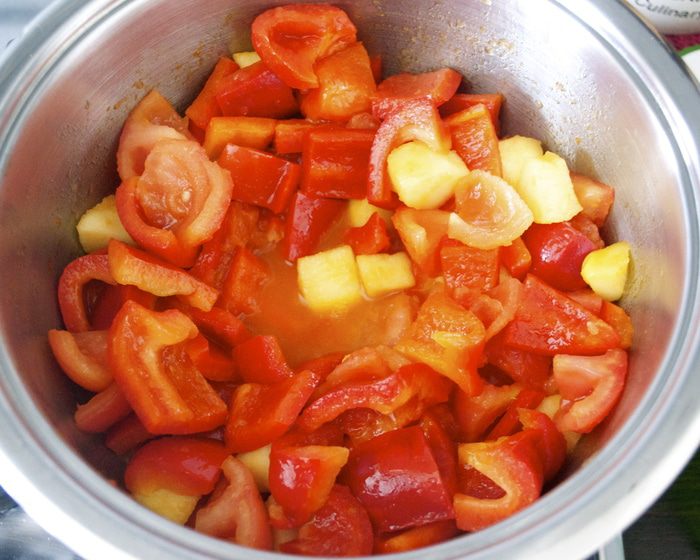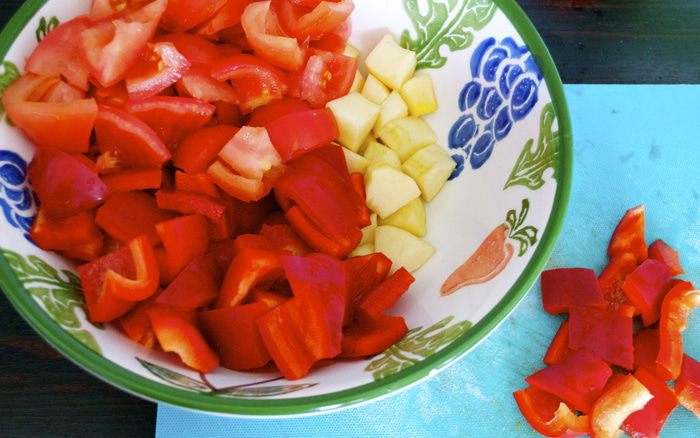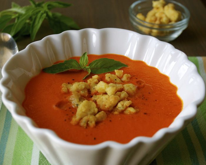 В кастрюльку добавить оливоковое масло и выложить все овощи. Слегка обжарить на несильном огне минуты 3, время от времени помешивая..., пока овощи не дадут немного жидкости. Добавить один половник овощного бульона (или воды), посолить и поперчить по вкусу и варить овощи до готовности (минут 15). В принципе, чем мельче нарезаны овощи, тем быстрее они приготовятся, т.ч. ориентируйтесь самостоятельно. Готовые овощи разбить погружным блендером до однородной консистенции и дать супу остыть. (Я чаще взбиваю такие супы-пюре в стационарном блендере, чтобы регулировать нужную мне консистенцию супа. Просто мне не нравятся очень жидкие супы-пюре, поэтому я перекладываю овощи в блендер, тщательно взбиваю, и уже при необходимости добавляю немного жидкости из кастрюли.)