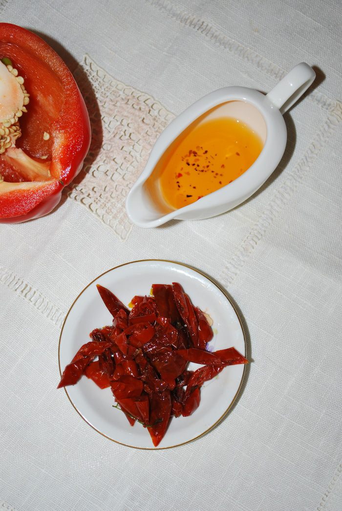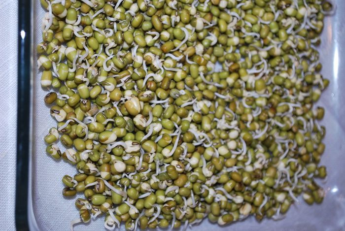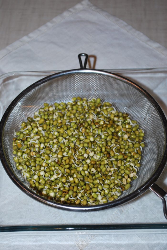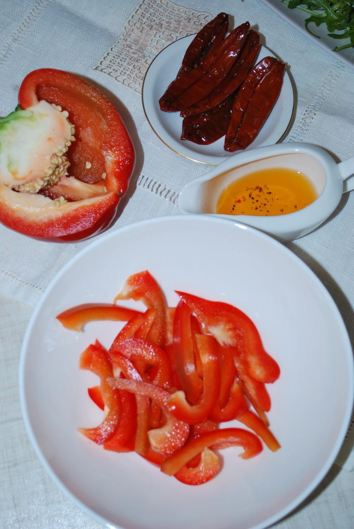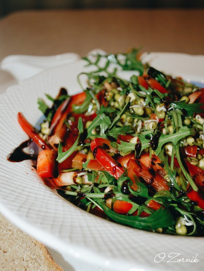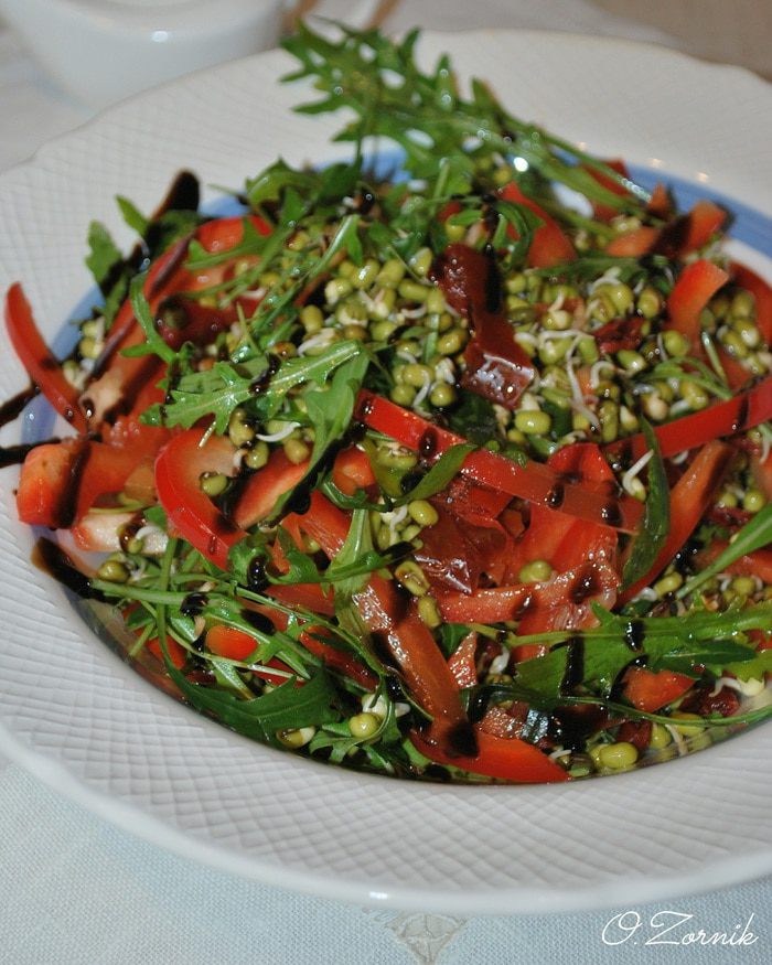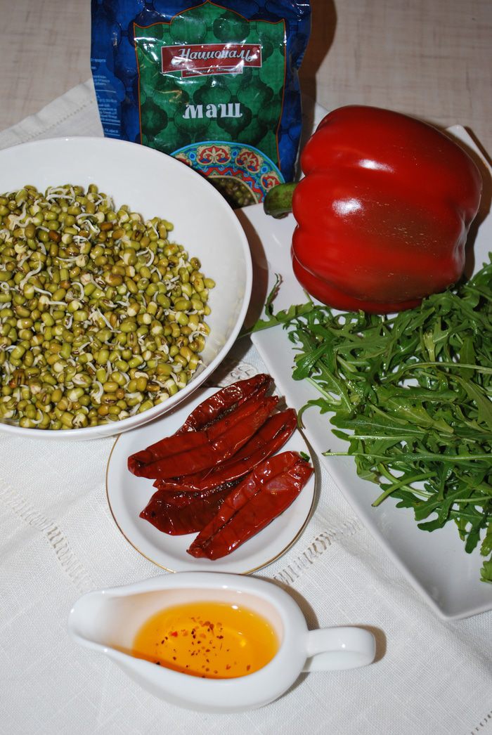 В пророщенный маш добавляем болгарский перец, вяленые помидоры, пряную руколу. Салат я заправила маслом от вяленых помидоров, оно у меня очень ароматное с чесноком и базиликом.Солим и перчим по вкусу. Сверху салат я полила бальзамическим соусом.Если такого ароматного масла из-под вяленых помидоров нет, можно добавить по вкусу чеснок или ароматные травы по своему вкусу. Или сделать соус с чесноком, соевым соусом и медом.