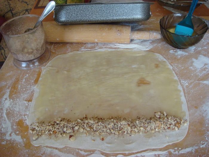 Тесто смазать сливочным маслом 1:1 с подсолнечным (примерно грамм по 50), распределить орехи и свернуть в рулетик не туго. Края защипнуть.