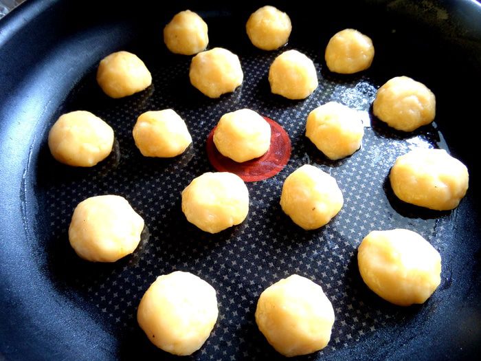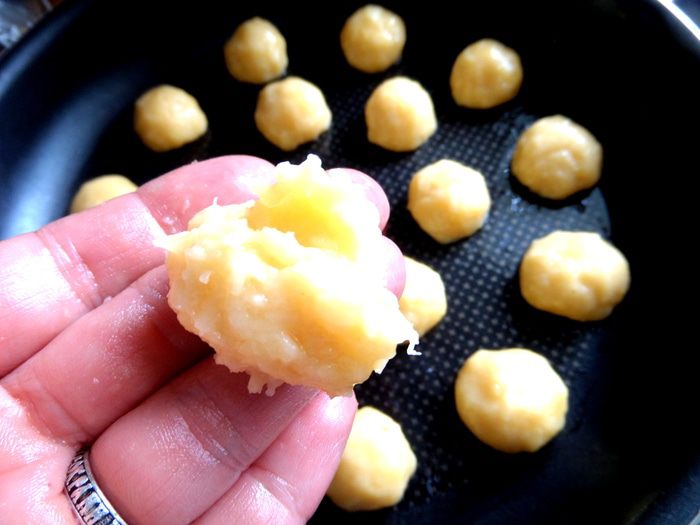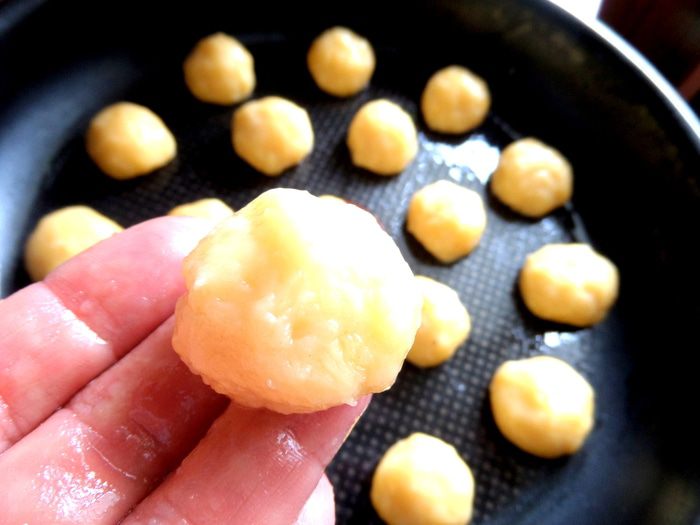 Смочить пальцы в растительном масле и взять ложкой шарик теста размером с грецкий орех.