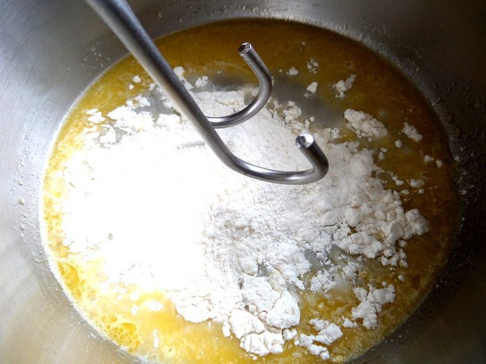 Снять с огня и всыпать муку. Взбить миксером с насадкой "крючки".