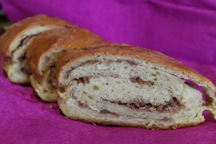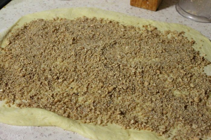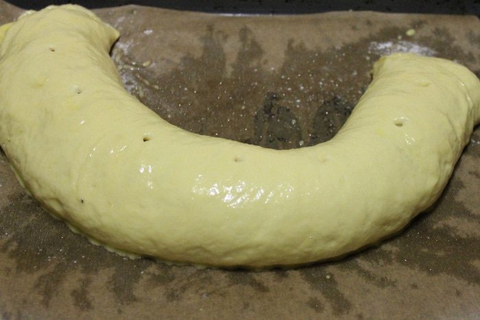 В большую миску кладем яйцо, сахар и ванилин. Перемешиваем венчиком и вливаем подошедшую опару. Хорошо все перемешиваем, добавляем растопленное сливочное масло, куркуму и цедру лимона. Постепенно добавляем просеянную муку. Тесто месить минут 5-7, до тех пор пока оно не перестанет липнуть к рукам. Скатываем в шар, накрываем полотенцем и оставляем на 2 часа в теплом месте. Через час, тесто нужно обмять.
