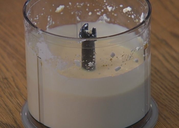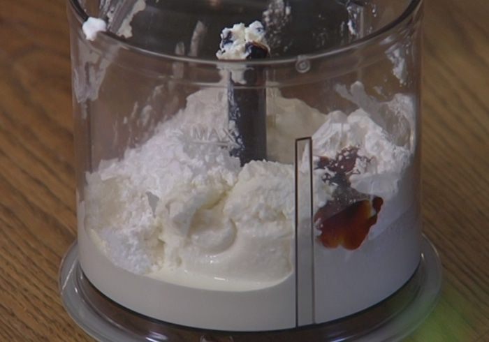 В чаше блендера соединить рикотту, сливки, сахарную пудру, ванильный экстракт и все взбить в однородную массу.