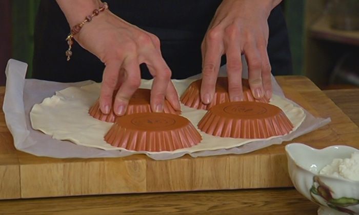 Если пласт теста недостаточно тонкий, немного его раскатать и формочками для выпечки вырезать из теста круги.