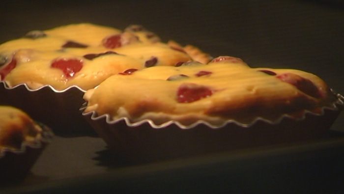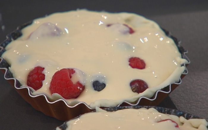В каждую формочку с тестом выложить по небольшой горсти ягод и разлить творожную начинку.