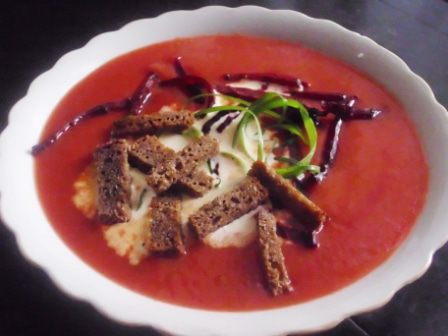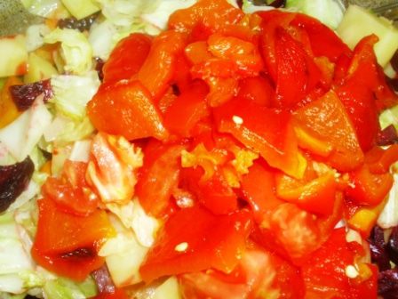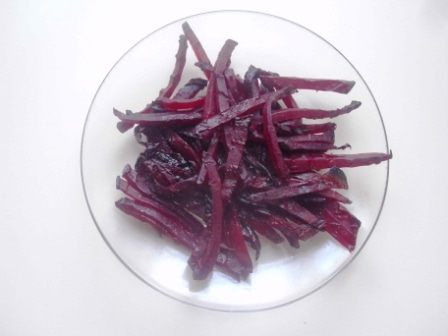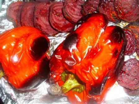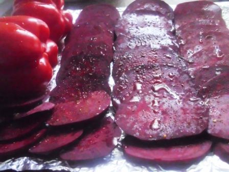 Свеклу почистить, порезать ломтиками толщиной 0,3 см, выложить на противень вместе с перцами. Сбрызнуть слегка оливковым маслом и посыпать приправой. Я использовала готовую смесь для борща (кориандр молотый, паприка, чеснок, петрушка, укроп, перец черный молотый, лавровый лист). Запекать в духовке около 20 минут.