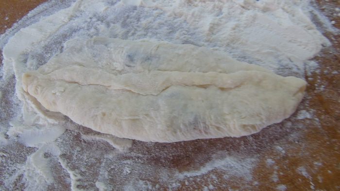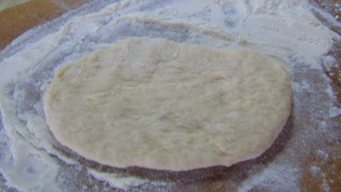 Разделите тесто на две половины, а затем каждую на 6 кусочков. Руками или скалкой растяните тесто на хорошо присыпанной мукой поверхности.