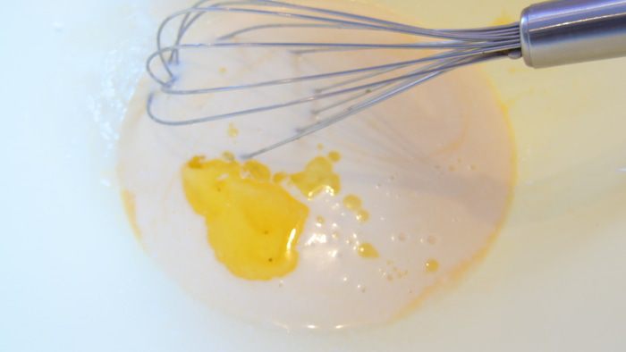 Кефир подогрейте до 36°С, добавьте к яйцу и влейте растительное масло. Взбейте венчиком.