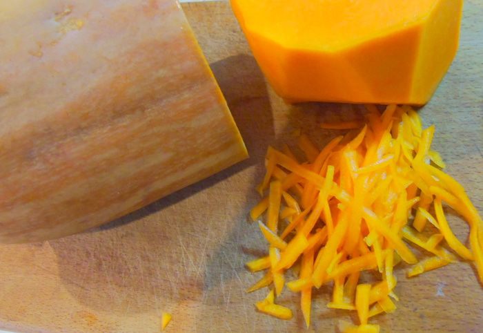 Начнем с начинки. Тыкву натрите на терке.