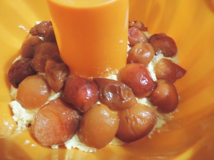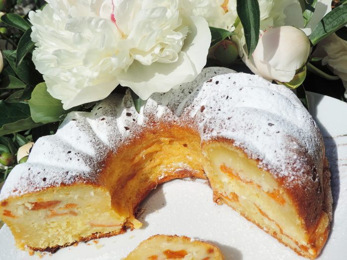 Выкладываем в форму 1/3 теста, затем выкладываем слой абрикос, снова 1/3 теста, абрикосы и оставшееся тесто.