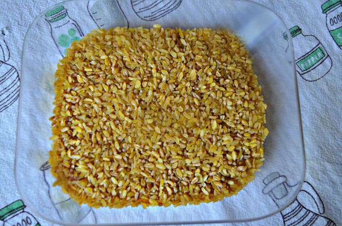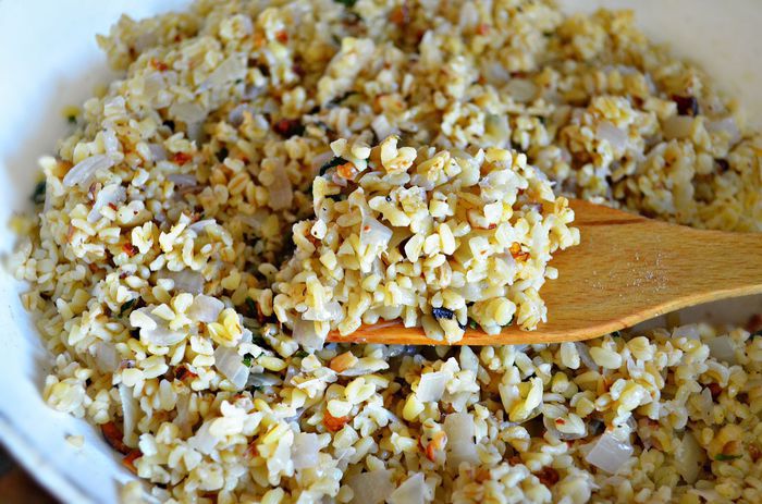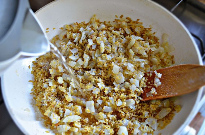 К обжаренному луку добавить булгур, соль и залить 250мл кипятка. Закрыть сковороду крышкой и готовить 15 мин, периодически помешивая. Если понадобится, добавить немного воды.
