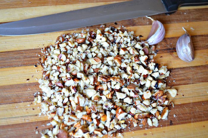 Грецкие орехи мелко порубить, измельчить чеснок.