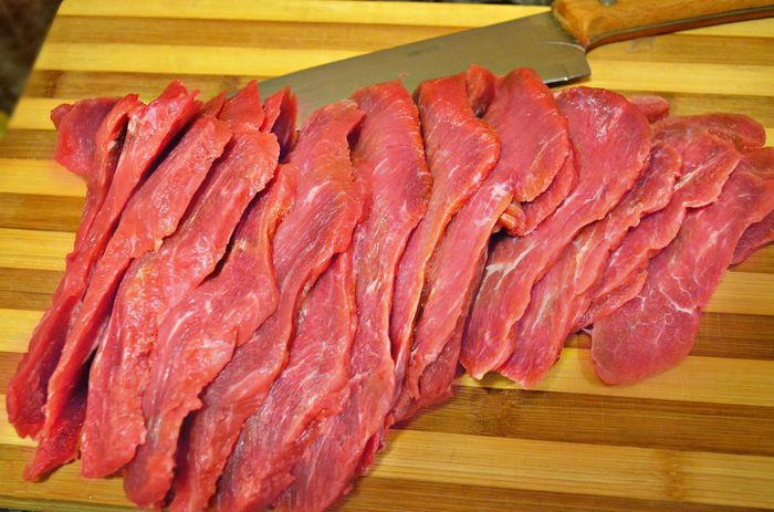 Мясо промыть нарезать на тонкие куски, как для лангета (50 - 70г).