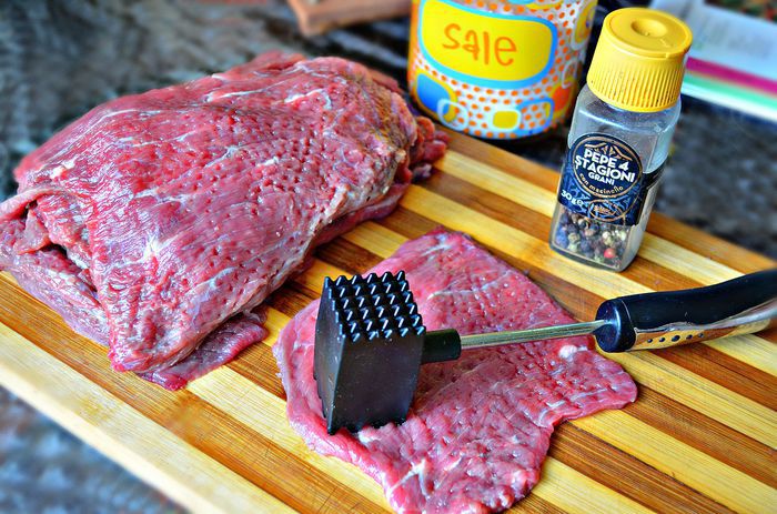 Отбить хорошо мясо молоточком, посолить и поперчить.