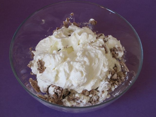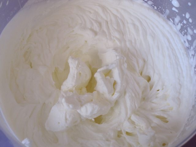 150 мл сливок взбить и ввести в маскарпоне с сахарной пудрой. Поставить в холодильник на 30 минут.